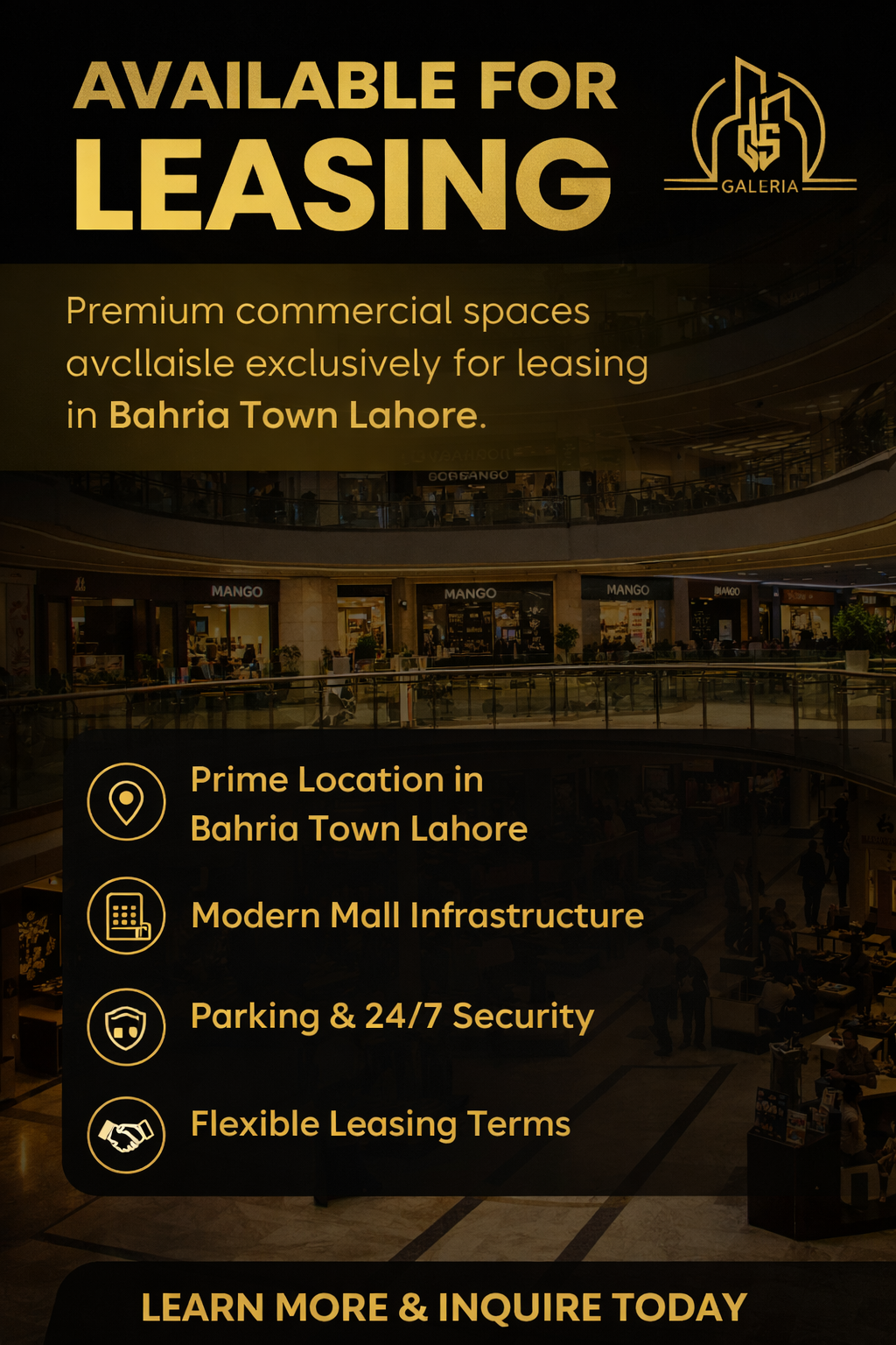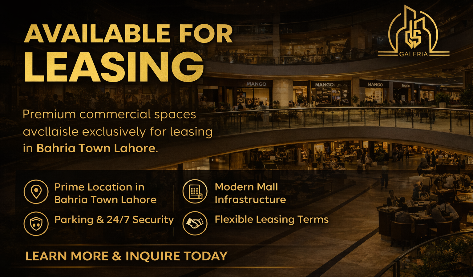 QS Galleria is an upcoming modern commercial destination in Bahria Town Lahore, designed to become the city’s hub for shopping, dining, and entertainment. With contemporary architecture, premium retail outlets, a vibrant food court, and family-friendly entertainment spaces, QS Galleria aims to deliver a high-footfall experience for visitors and strong business potential for brands. Strategically located near major attractions, the project is planned with modern facilities, ample parking, and a seamless customer experience—setting a new benchmark for commercial developments in the area.